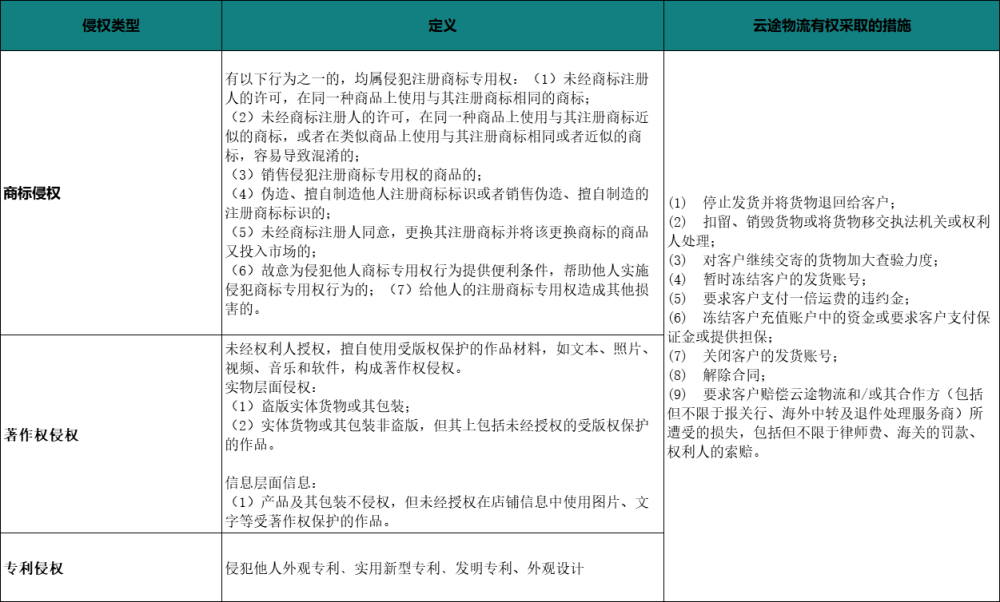 1.如乘着风物流自查发现客户的货物涉嫌侵犯第三方知识产权,乘着风物流有权按照客户货物被发现侵权时的状态及情节严重程度,对客户实施以上任一一项或几项措施;