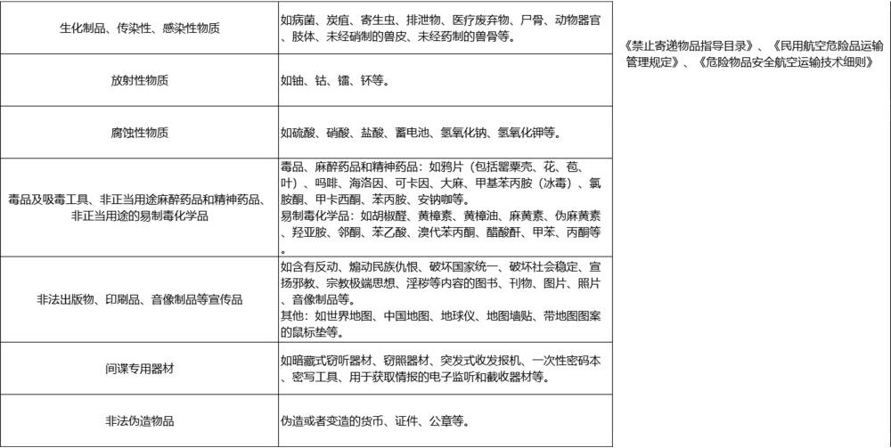 1、考虑到不同国家/地区对于寄递物品的禁止/限制规定存在差异,故以上清单并未涵盖全部的禁止/限制寄递物品,清单明细仅作为客户的部分参考指引,因此对于寄递过程中所涉及的清单以外的物品是否为禁限寄物品,具体还需结合客户递寄物品性质、物品始发地、中转地、目的地等相关政策规定综合认定。